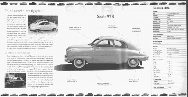 Den omfattade 45 modeller från 92001 år 1947 till 9.5 Sport Combi Aero år 2012. Här finns alla modellerna i bifogad PDFfil en bit ner på sidan här. Du kan se innehållet i den beskrivning som leverades med varje modell. En PDF fil finns på SAAB 92 B som syns på bilden här.