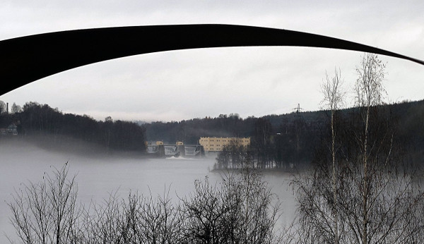 En nytagen bild en disig novemberdag från bågen vid Domnarvsgården med Bullerforsens kraftstation i bakgrunden. Ger el till låg kostnad.